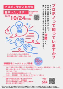 今回は、このプロボノを受け入れたい団体(NPO法人や一般社団法人、法人格のない市民活動団体など)を募集します。